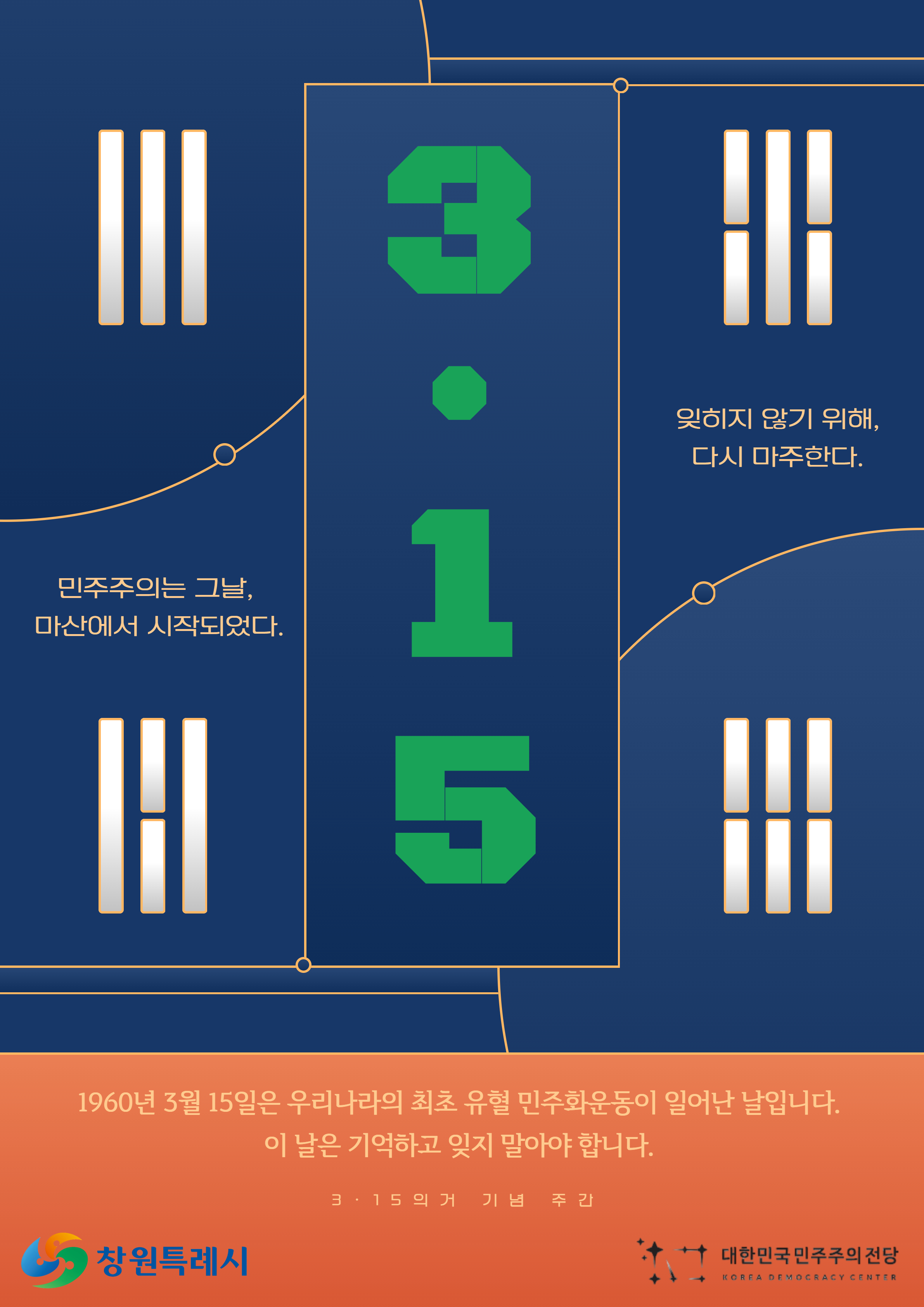 ○ 프로그램 : 3·15의거-「대통령은 왜 떠났을까?」 ○ 운영일시 : 2026년 3월 14일 토요일 오후 2시(1회) 2026년 3월 20일 금요일 오후 2시(2회) 2026년 3월 21일 토요일 오후 2시(3회) ○ 운영대상 : 초·중·고등학생 ○ 운영장소 : 대한민국민주주의전당 2층 교육회의실(창원시 마산합포구 소재) ○ 활동내용 : 3·15의거 역사탐구 교육※ 홈페이지에서 확인 가능 ○ 접수방법 : 대한민국민주주의전당 홈페이지 사전접수 및 전화접수 ○ 신청기간 :각 회차 전까지(정원 마감 시 조기 마감) ○ 문 의 : 대한민국민주주의전당 055-225-7068 |