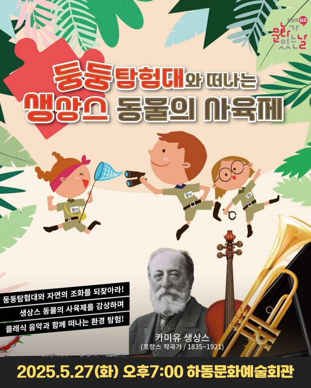 2025년 구석구석문화배달사업으로 진행하는 어린이뮤지컬 '둥둥탐험대와 떠나는 생상스 동물의 사육제' 공연이 다음과 같이 개최되오니,전 부서 및 읍면에서는 관심있는 군민들이 공연을 관람할 수 있도록 적극 홍보하여 주시기 바라며, 관내 어린이집, 유치원, 초등학교에서도 많은 관람 부탁드립니다. 가. 공연일시: 2025. 5. 27.(화) 19:00 *러닝타임 60분 나. 공연장소: 하동문화예술회관 대공연장 다. 공연단체: (사)경남예술문화단체총연합회 라. 공연소개: 자연의 균형이 무너지고 있다는 소식을 듣게 된 '둥둥탐험대'는 지구 곳곳에 흩어진 동물 친구들을 찾아가 환경을 회복 할수 있는 단서인 '퍼즐조각'을 모으는 모험 을 떠나며 벌어지는 이야기 마. 관람대상: 초등학생 이하 아동 및 가족 바. 관 람 료: 무료 사. 신청기간 : 2025. 5. 26.(월) 12:00까지 아. 신청방법 : 포스터 QR코드로 네이버 폼에 접속 또는 홈페이지(www.gnfacok.kr)신청