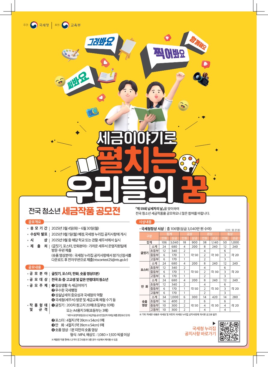 국세청은 청소년들이 세금에 대해 관심을 같고 의미를 생각하는 과정에서 자연스럽게 올바른 납세의식이 정립되도록 하기 위한「청소년 세금작품 공모전」을 붙임과 같이실시하고 있으니, 청소년들이 참여할 수 있도록 적극 협조 바랍니다. 글짓기 온라인 공모 접수처는 이메일(g164z22@nts.go.kr) 이며, (글짓기, 포스터, 만화 분야) 제출 및 기타 관련사항 문의는 진주세무서 운영지원팀 윤경현 조사관(☎ 055-751-0244)에게 주시기 바랍니다.