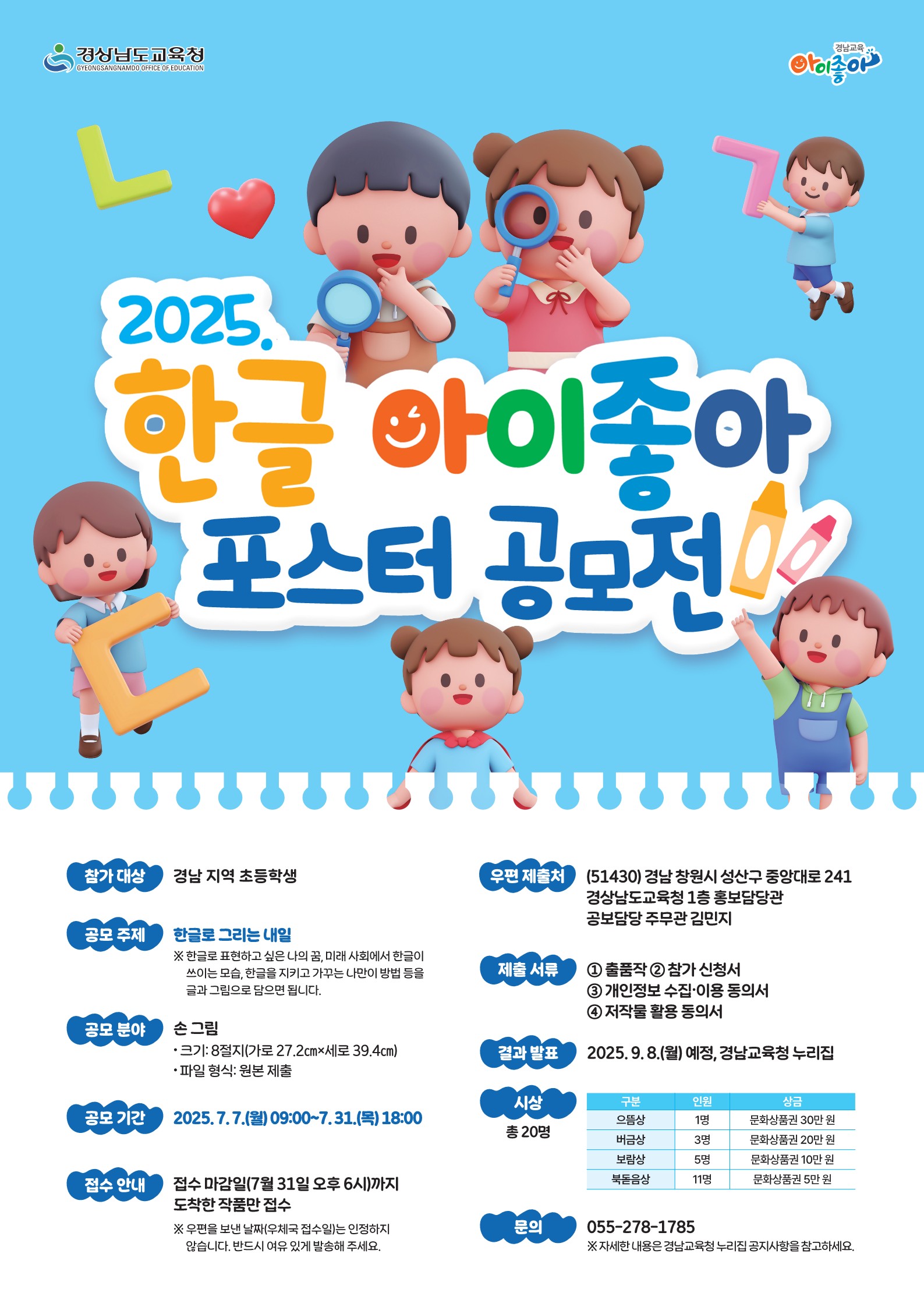 문화체육관광부의 국어책임관 업무 최우수 기관에 선정된 우리 교육청은 한글의 우수성과 소중함을 널리 알리고자 ‘한글 아이좋아 포스터 공모전’을 개최합니다. 가. 공모 주제: 한글로 그리는 내일 나. 참가 대상: 경남 지역 초등학생 다. 공모 분야: 학생이 크레용 등 도구를 이용해 직접 그린 손 그림 라. 공모 기간: 2025. 7. 7.(월)~7. 31.(목) 마. 참가 방법: 우편(51430 경남 창원시 성산구 중앙대로 241 경남교육청 1층 홍보담당관 공보 담당 앞) 바. 제출 서류: ①출품 작품 ②참가 신청서 ③개인정보 수집·이용 동의서 ④저작물 활용 동의서 사. 결과 발표: 2025. 9. 8.(월) 예정, 경남교육청 누리집 아. 시상: 으뜸상(1명, 문화상품권 30만 원), 버금상(3명, 각 20만 원), 보람상(5명, 각 10만 원), 북돋음상(11명, 각 5만 원) 등 총 20명