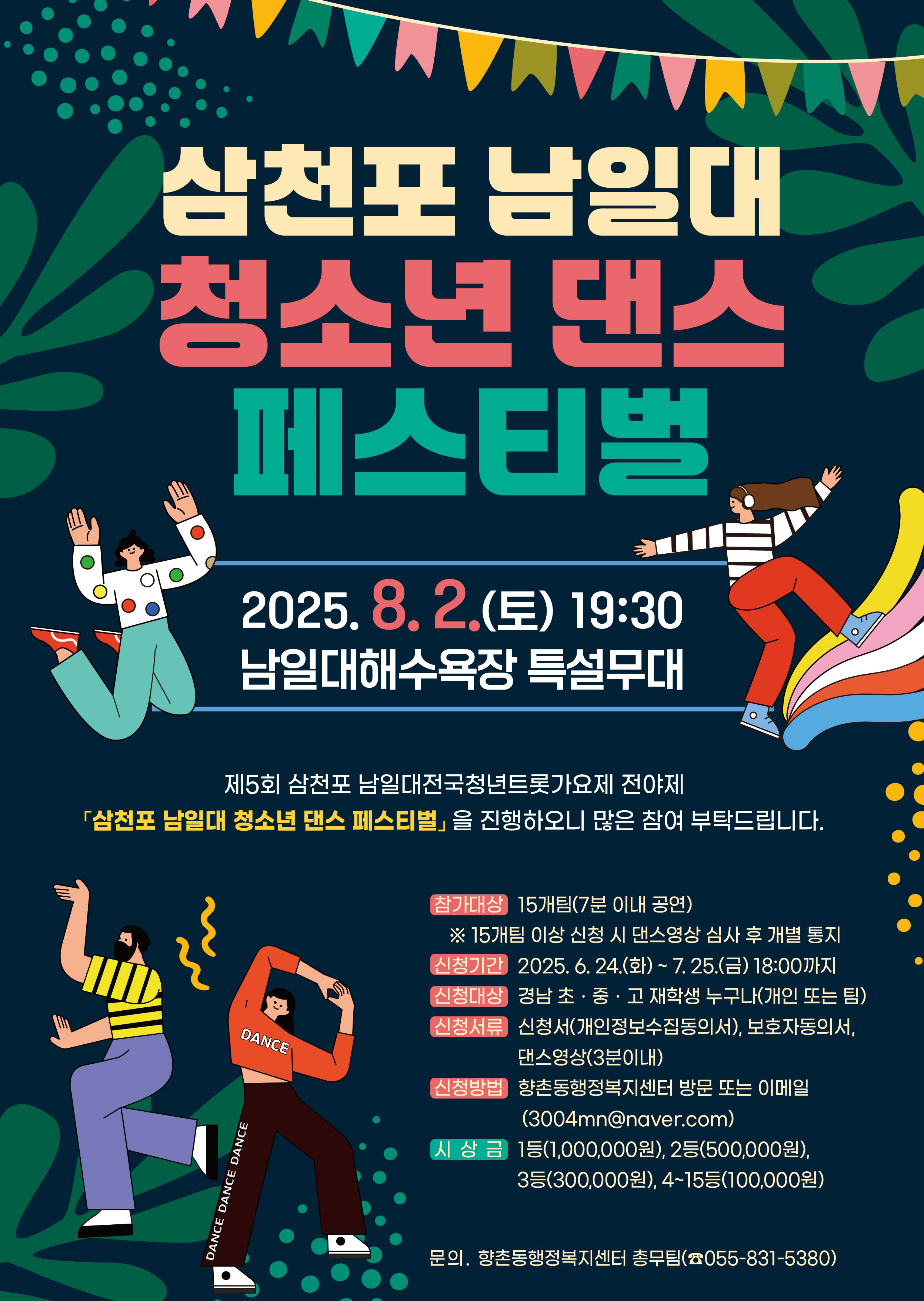 ○ 행 사 명: 제5회 삼천포남일대전국청년트롯가요제전야제「청소년 댄스 페스티벌」 ○일시/장소: 2025. 8. 2.(토) 19:30 / 남일대해수욕장 특설무대 ○ 참가대상: 15개팀(7분이내 공연) ※ 15개팀 이상 신청시 댄스영상 심사 후 개별통지 ○신청기간:2025. 6. 24.(화) ~ 7. 25.(금) 18:00까지 ○ 신청대상:경상남도 초·중·고 재학생 누구나(개인 또는 팀) ○ 신청서류: 신청서(개인정보수집동의서), 보호자동의서, 댄스영상(3분이내) ○ 신청방법: 향촌동행정복지센터 방문 또는 이메일(3004mn@naver.com) ○ 시 상 금: 1등 1,000,000원, 2등 500,000원, 3등 300,000원, 4~15등 100,000원 ○ 문 의: 향촌동행정복지센터 총무팀 (☎ 055-831-5380)