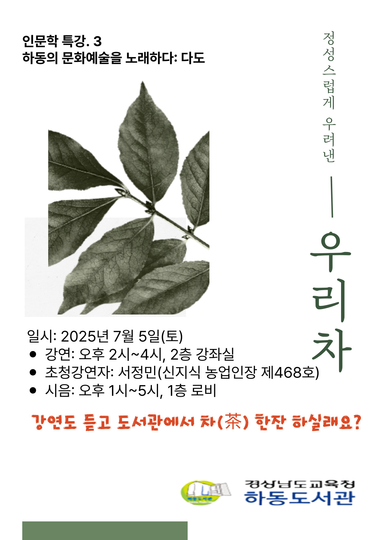 우리 도서관은 지역의 인문학 발전을 위해 매년 다양한 ‘인문학 특강’을 개최하고 있습니다. 올해는 ‘하동의 문화예술을 노래하다!’라는 주제로, 다양한 인문학 특강을 마련하였습니다. 이와 관련하여 3회차 특강 및 차 시음 행사를 아래와 같이 운영합니다. 귀교의 학생, 학부모, 직원들이 참여할 수 있도록 많은 홍보 협조 바랍니다. 가. 행사일시 및 장소: 2025년 7월 5일(토) 오후 1시 ~ 5시 - 특강: 오후 2시 ~ 오후 4시, 2층 강좌실 - 차 시음 행사: 오후 1시 ~ 오후 5시, 2층 휴게실 나. 특강주제: 하동의 차와 블랜딩 차의 이해 다. 초청강사: 서정민(신지식 농업인장 제468호) 라. 문 의: 종합자료실 884-7995