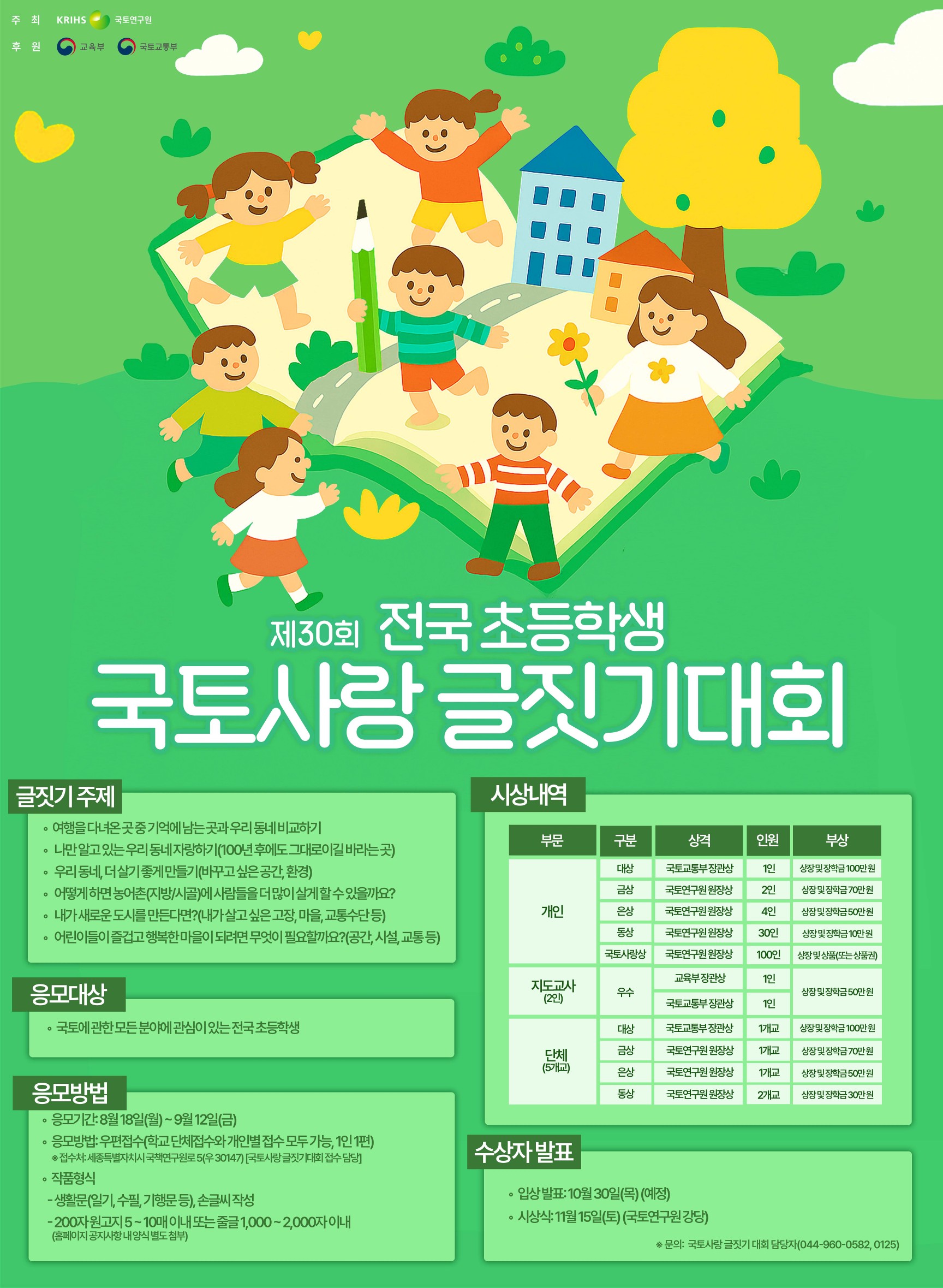국토연구원은 국토·지역·도시분야 등의 연구를 수행하고 있는 정부출연 연구기관이며, 교육부와 국토교통부 후원으로「전국 초등학생 국토사랑 글짓기 대회」를 개최하고 있습니다. 올해 제30회 대회의 응모작품을 다음과 같이 모집하오니, 귀 학교의 어린이들이 단체 또는 개인 자격으로 참가할 수 있도록 홍보와 협조를 요청 드립니다. 가. 행 사 명 :「제30회 전국 초등학생 국토사랑 글짓기대회」 나. 주 최 : 국토연구원 다. 후 원 : 교육부, 국토교통부 라. 응모자격 : 전국 초등학생 마. 응모주제 - 여행을 다녀온 곳 중 기억에 남는 곳과 우리 동네 비교하기 - 나만 알고 있는 우리 동네 자랑하기(100년 후에도 그대로이길 바라는 곳) - 우리 동네, 더 살기 좋게 만들기(바꾸고 싶은 공간, 환경) - 어떻게 하면 농어촌(지방/시골)에 사람들을 더 많이 살게 할 수 있을까요? - 내가 새로운 도시를 만든다면?(내가 살고 싶은 고장, 마을, 교통수단 등) - 어린이들이 즐겁고 행복한 마을이 되려면 무엇이 필요할까요?(공간, 시설, 교통 등) 바. 진행일정 ? 응모기간 :2025. 8. 18.(월) ~ 2025. 9.12.(금) 소인분까지(우편접수) ※ 작품분량 : 원고지(200자) 5~10매 이내 또는 줄글 1,000~2,000자 이내 ? 입상발표 : 2025. 10. 30.(목) 예정 ※ 상세 공고내용은 붙임 및 국토연구원 누리집(www.krihs.re.kr)공지사항 참조