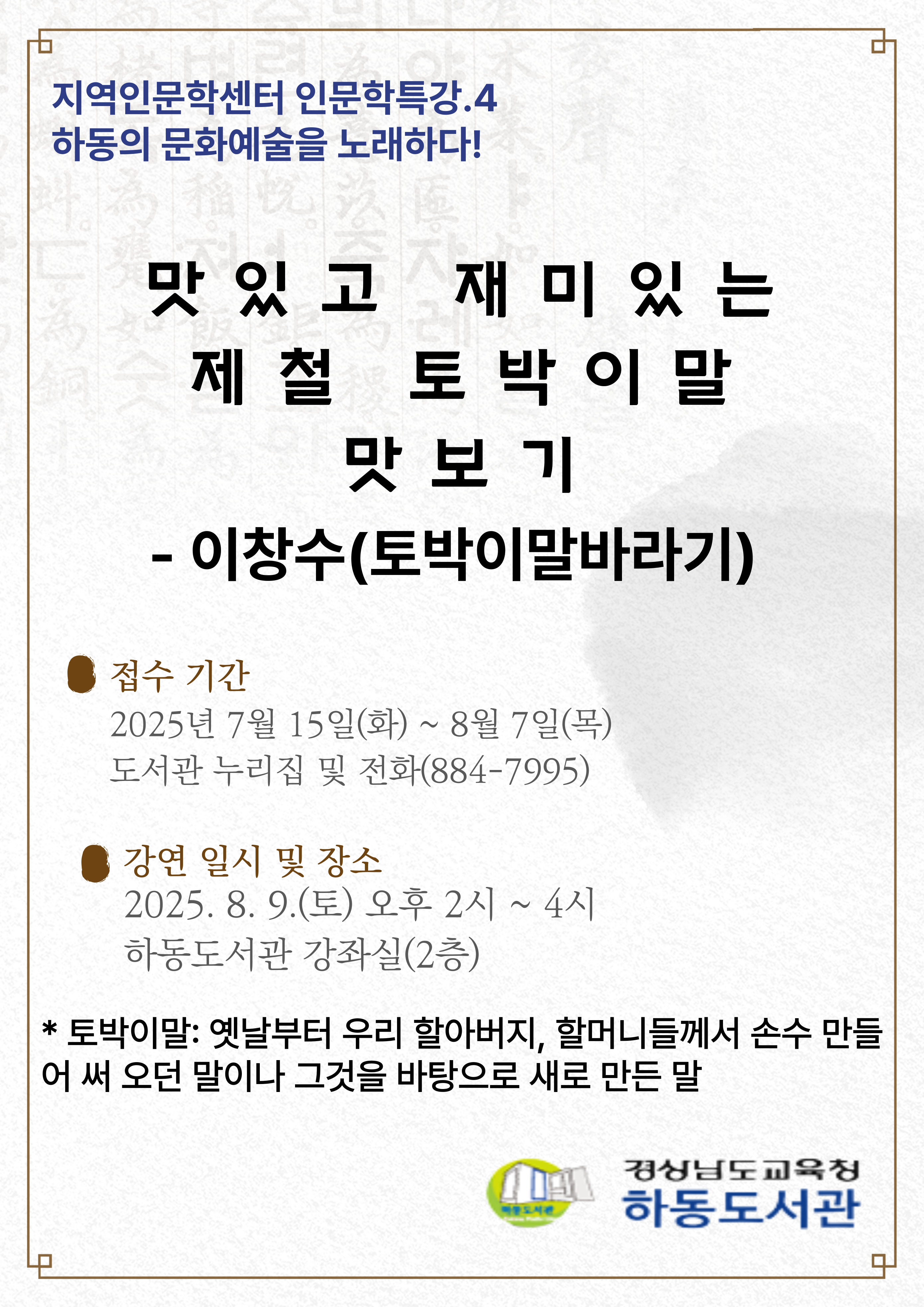 인문학 발전을 위해 매년 다양한 ‘인문학 특강’을 개최하고 있습니다. 올해는 ‘하동의 문화예술을 노래하다!’라는 주제로, 다양한 인문학 특강을 마련하였습니다. 이와 관련하여 4회차 특강을 아래와 같이 운영함을 알려드립니다. 가. 특강일시: 2025년 8월 9일(토) 오후 2시 ~ 4시 나. 특강장소: 하동도서관 2층 강좌실 다. 특강주제: 맛있고 재미있는 제철 토박이말 맛보기 라. 초청강사: 이창수(토박이말바라기, 도산초등학교 교사) 마. 문 의: 종합자료실 884-7995